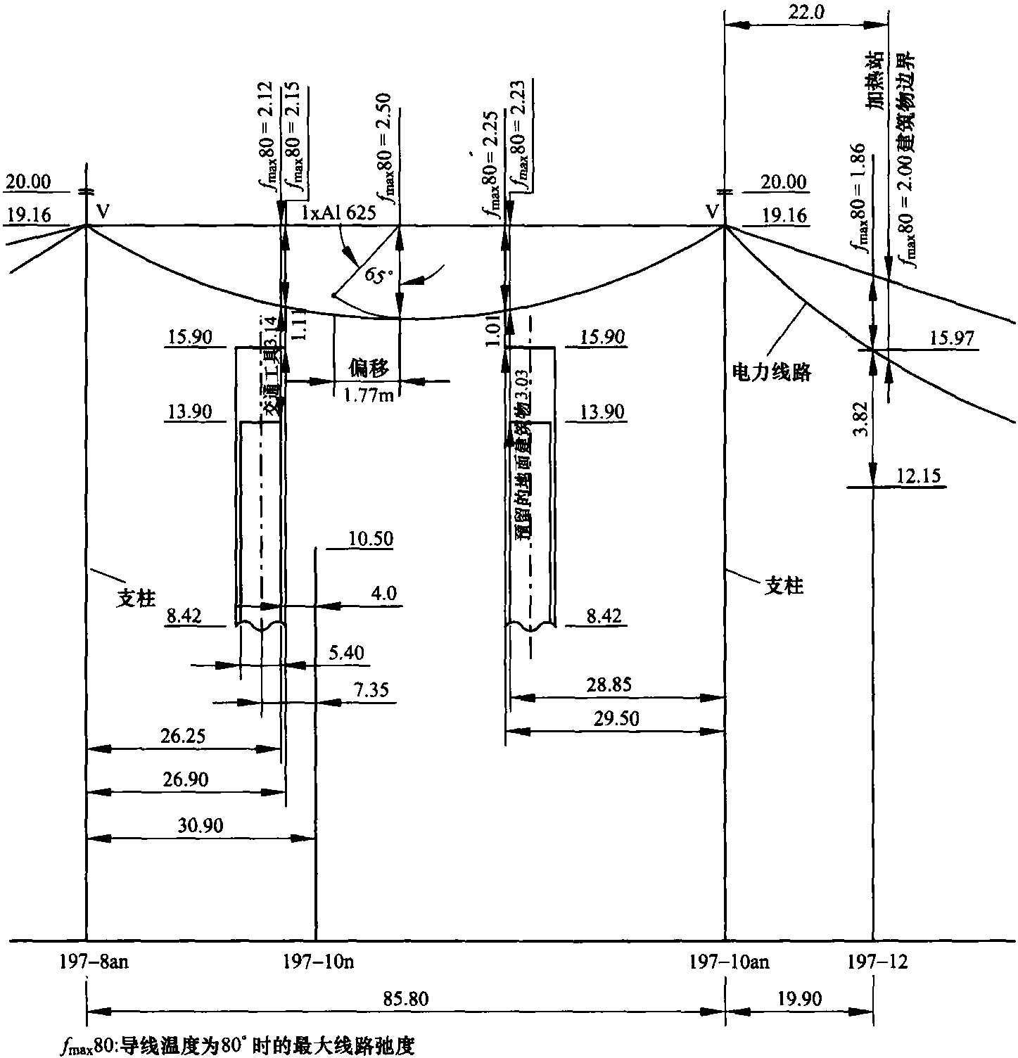 牽引供電線的縱剖面圖包括建筑結構和其他設備的凈空。與縱剖面圖的表示方法相同,線路縱向斷面以不同的比例畫出,通常沿線路為1:500,垂直線路為1:100。圖6.62是縱剖面圖的局部圖。