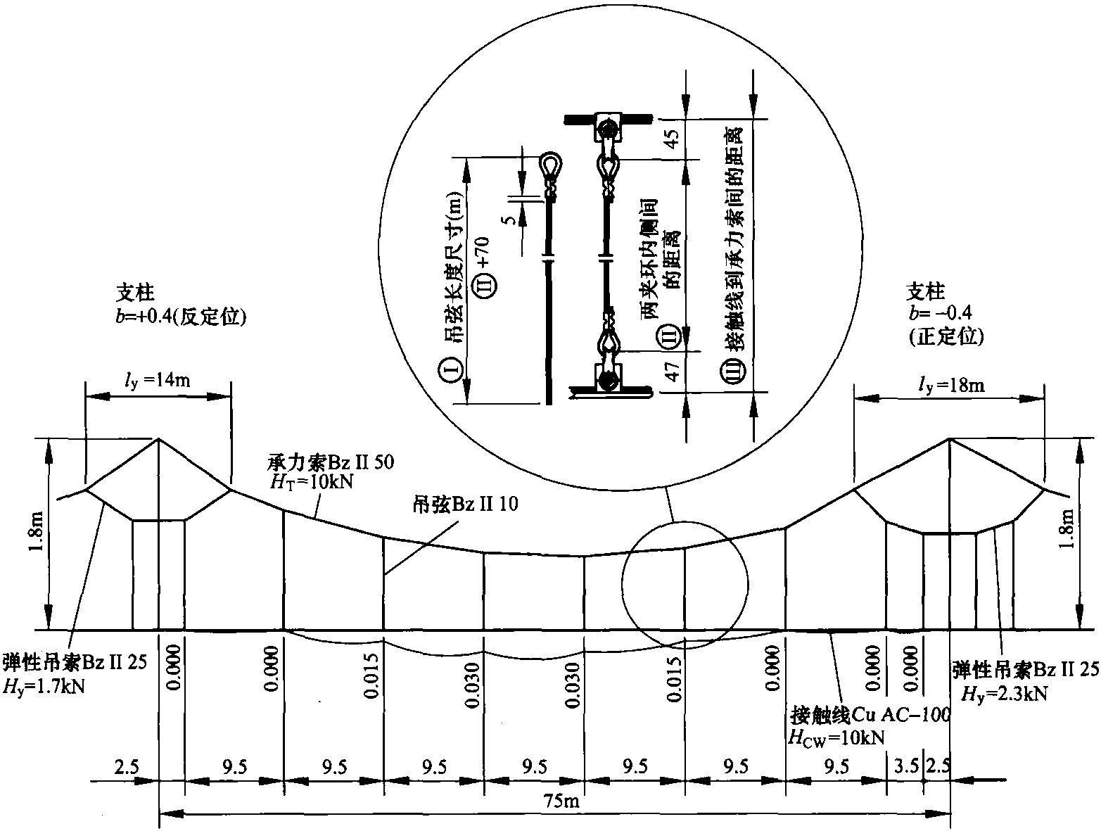 網系統的彈性吊索吊弦的設置。75m長的跨距其吊弦的間距為9.5m(見圖6.60)。