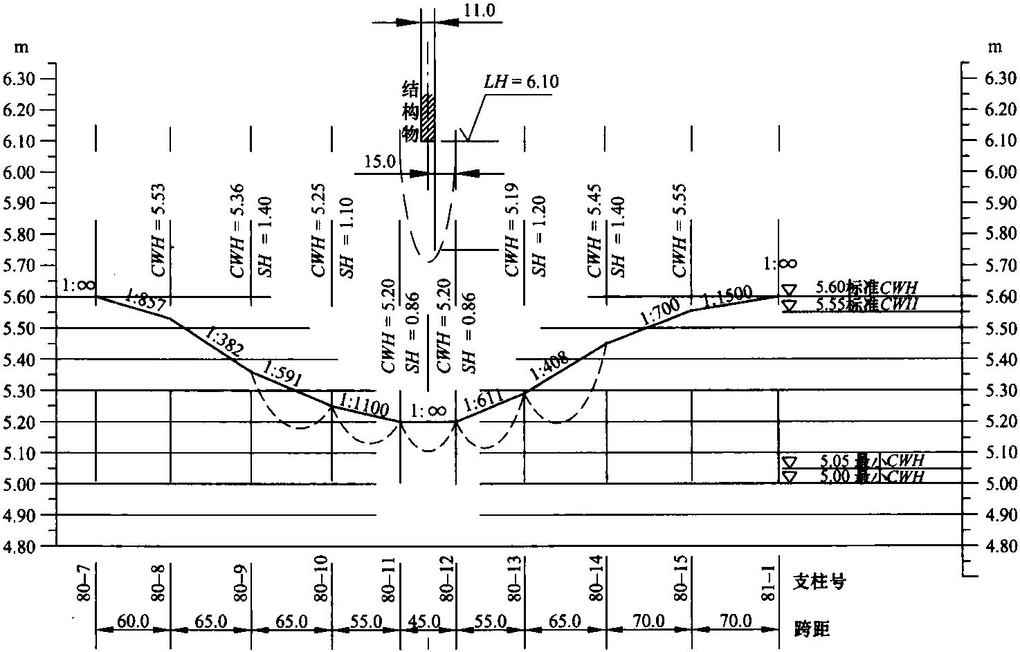 應對鄰近橋梁的4到5個跨的冰荷載下的接觸線弛度進行描述,以驗證軌頂平面與接觸線之間的凈空是否滿足最低凈空標準。