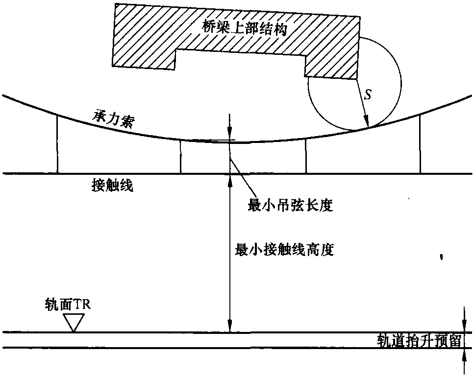 德國鐵路的架空接觸網(wǎng)系統(tǒng)帶電部件與結(jié)構(gòu)之間的靜態(tài)凈空距離為300mm。如果不能達(dá)到圖6.37中用于標(biāo)準(zhǔn)接觸線和結(jié)構(gòu)高度的最小凈空值S,那么首先通過縮短跨距來降低承力索的高度。當(dāng)在跨距中間達(dá)到最小的吊弦長度時(shí)就不允許再縮短距離了 (見圖6.37)。如果凈空還不夠的話,可通過將接觸線降低至最低允許高度,以免重新改造橋梁?紤]到所有因素影響包括超級超限貨物運(yùn)輸?shù)难b載限界等,接觸線的高度不應(yīng)低于5.15m。如果還需降低結(jié)構(gòu)高度,可使用安裝高度約為70mm的滑動吊弦取代標(biāo)準(zhǔn)吊弦。然而這會影響接觸網(wǎng)彈性。彈性不均勻會引起接觸線的磨損不均勻。因而滑動吊弦只適用于120km/h以下的線路。