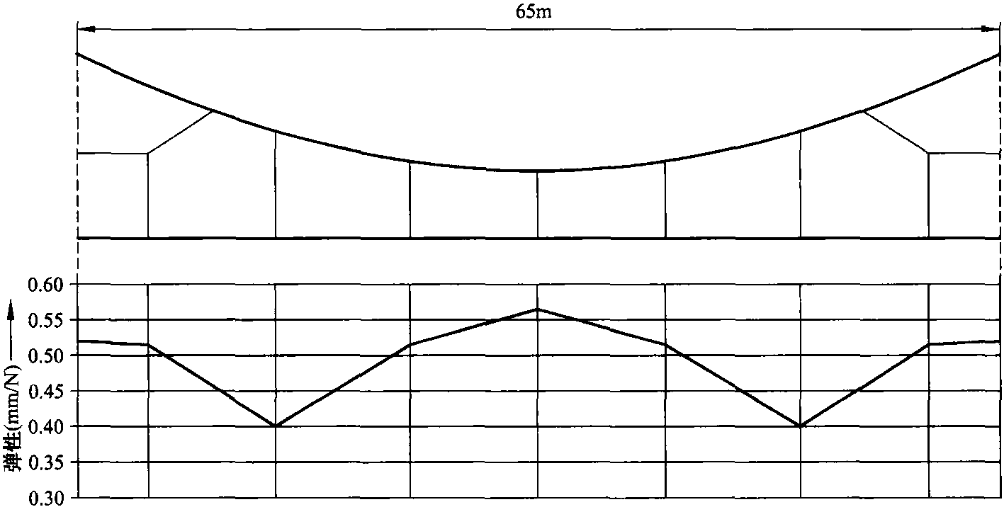 圖9.39為計算出的德國鐵路設計的Re250型接觸網(wǎng)的彈性圖形。[9.17] 中描述了相應的計算方法。圖9.40中列出了德國鐵路各種標準的接觸網(wǎng)的經(jīng)過大量測量得出的各種數(shù)值,以供比較。