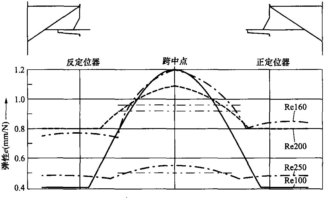 懸掛點外的彈性取決于接觸網(wǎng)設備的結構。如果在懸掛點上的接觸網(wǎng)沒有彈性吊索,懸掛點上的彈性只能實現(xiàn)跨中值的30% ~50%。但加上彈性吊索的接觸網(wǎng)懸掛點上的彈性可以大約增加到跨中值 (圖9.41) 的90%。