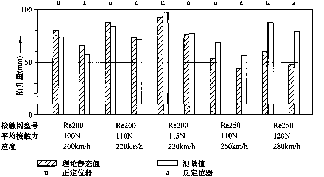 接觸網(wǎng)的抬升必須保持在最低限度,以便實現(xiàn)良好的接觸質量。此外,支持裝置的機械設計會限制在這些點上可能產(chǎn)生的垂直運動。在低、中速條件下,即運行速度達到約50%的波傳播速度時,抬升值與接觸網(wǎng)設備的彈性和受電弓作用的接觸壓力成比例。為了在提高速度時保持良好的接觸質量,接觸壓力也必須增加。這就是說必須保持盡可能低的彈性以限制抬升。