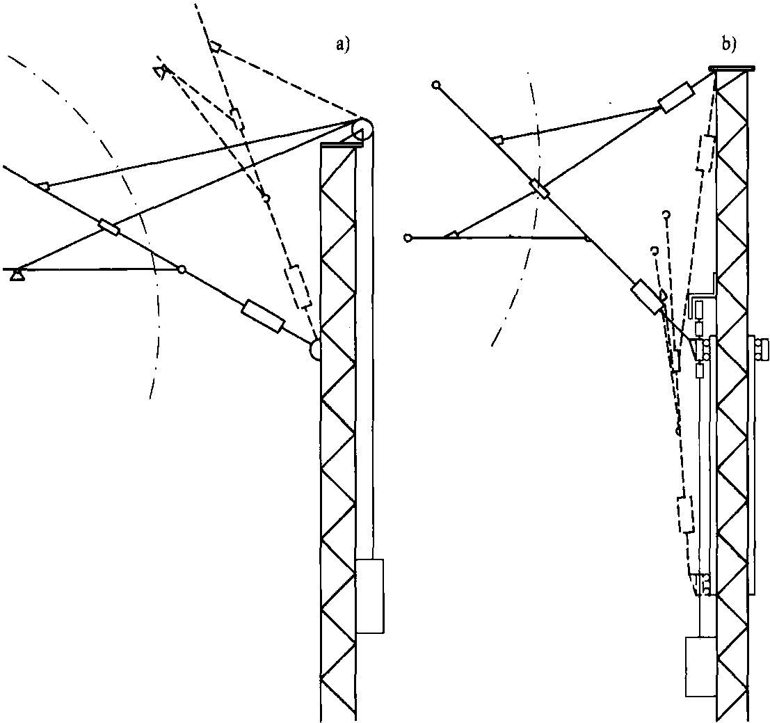 能夠讓接觸網區段的所有腕臂都圍繞其支柱垂直旋轉?梢匀鐖D8.29a) 那樣向上旋轉,也可以如圖8.29b) 那樣向下旋轉。由于接觸網是側向移動,因此當它移出軌道限界之外時也不會妨礙集裝箱的裝載作業。在這個操作過程中,接觸網的幾何形狀會發生改變。因此每個支柱都需要一個單獨的操作機構。