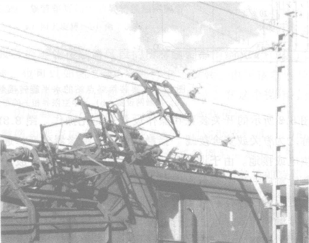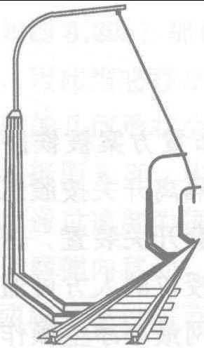 在礦區內,架設簡單接觸網電車線的支柱直接固定在可移動的鋼軌上,通常稱之為采場型接觸網(圖8.32)。鋼軌末端安裝著線架,被稱為末端固定架,以彌補礦區鐵路運行時對長度變化的要求。移動鋼軌前先通過斷路器將接觸網斷電,然后再將其接地。礦區電力機車側面裝有附加的受流器(圖8.33)。它們向股道區間內配置的用于編組操作的獨立移動裝置供電,而側面安裝的電車線為機車的裝卸作業提供了必要的空間 (圖8.34)。