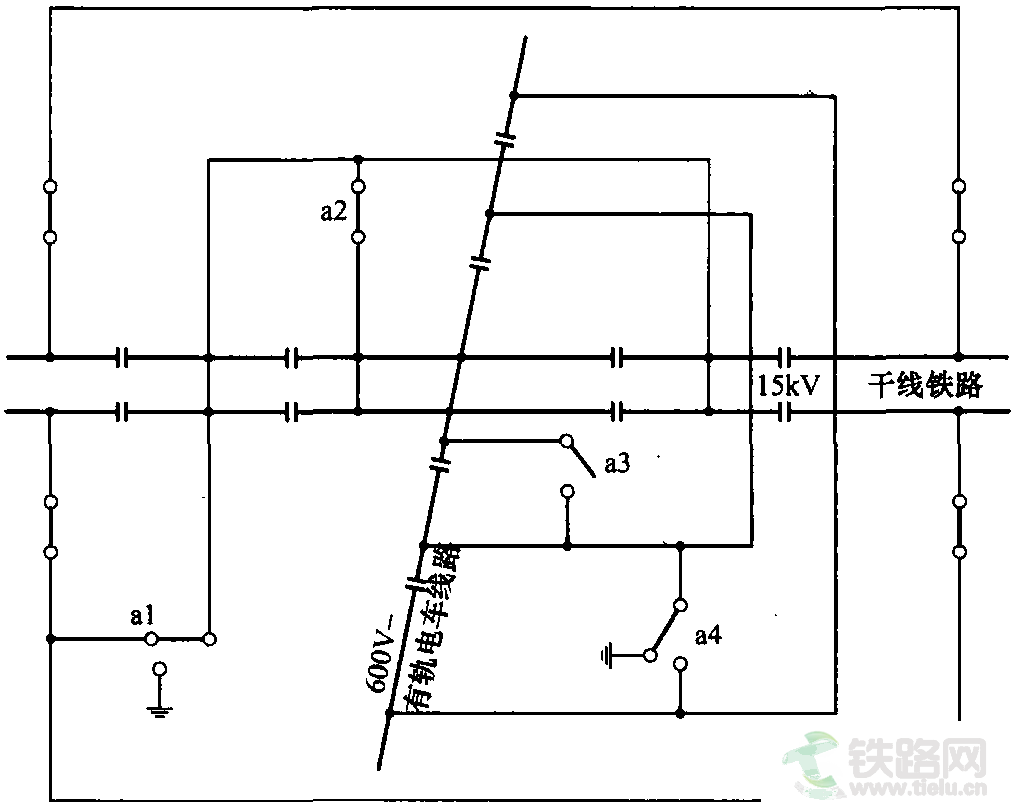 鐵路干線和城市輕軌平交道口的另一種設計方案如圖8.20的所示,它向干線鐵路的絕緣區段和中央區段供電的電壓為AC 15 kV。