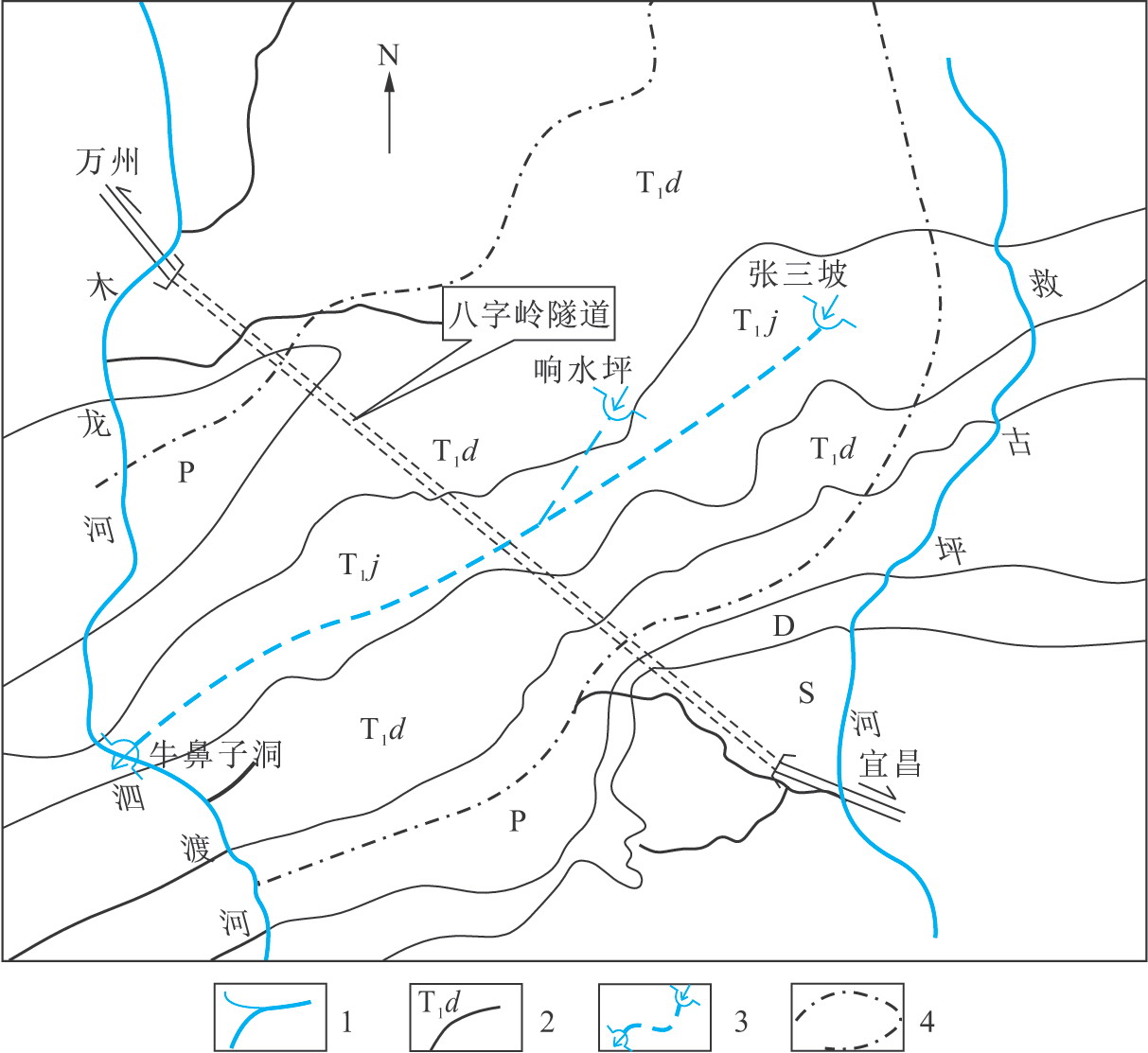 1.地表河流;2.地層界線;3.暗河及進出口;4.分水嶺