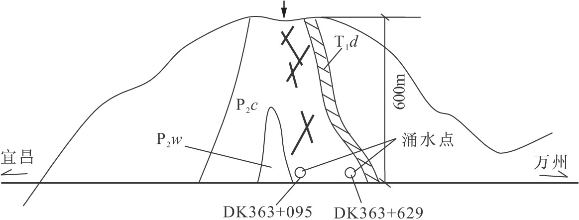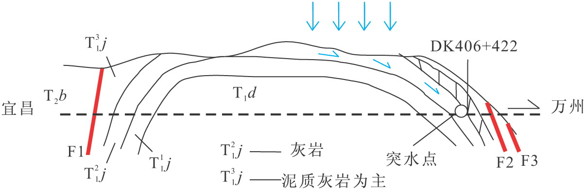 (1)如別巖槽隧道為箱型背斜,核部巖層產狀平緩,巖體變形、變動較小,節理裂隙欠發育;箱型背斜核部橫剖面的兩側的轉折端(核部產狀平緩處至兩翼產狀變陡的轉折部位)應力集中,巖體變形較大,破裂結構面(斷層和節理裂隙)發育(如東翼的茨竹埡斷層等),相應巖溶隨之發育,廟坪暗河的主要徑流段、隧道出口突水截流廟坪暗河的地段皆位于轉折端(圖2-8、圖2-9)。