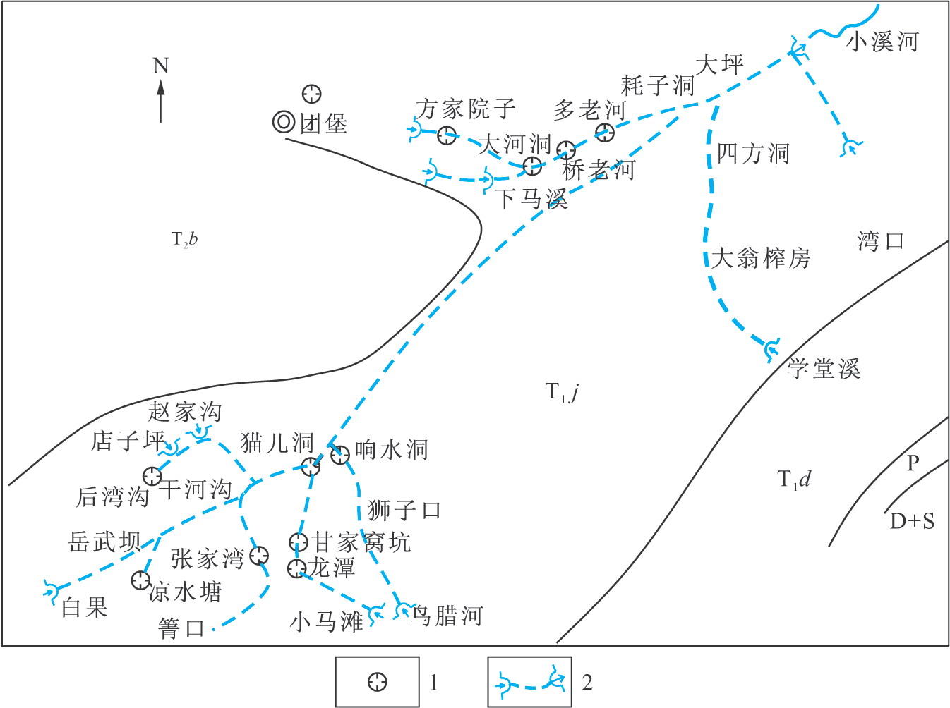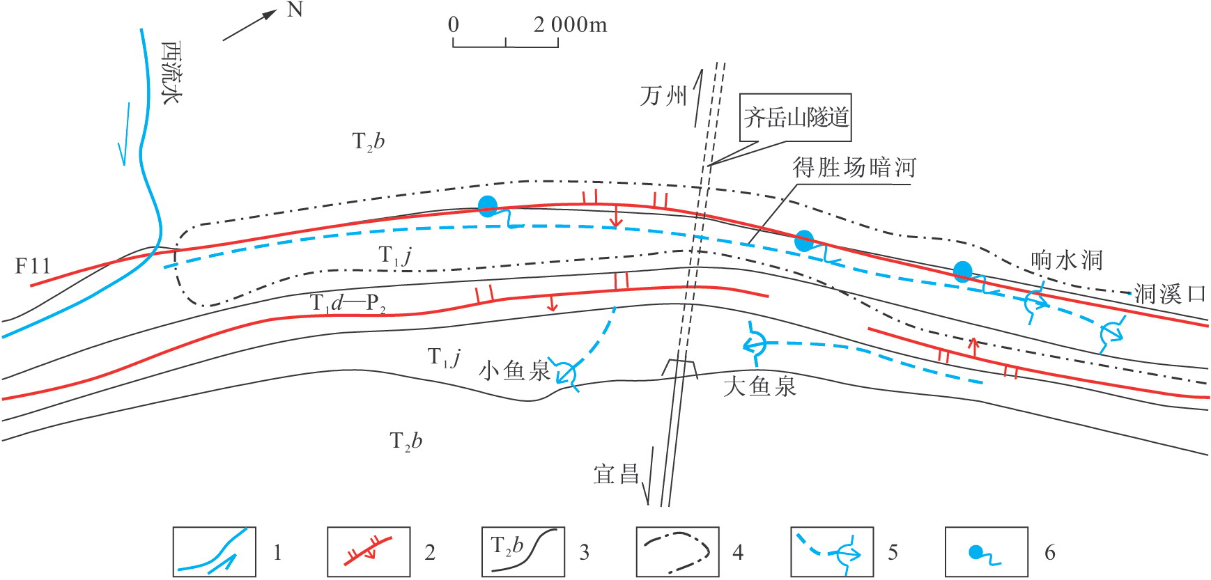 1.地表河流及流向;2.斷層;3.地層界線;4.分水嶺;5.暗河及出口;6.泉