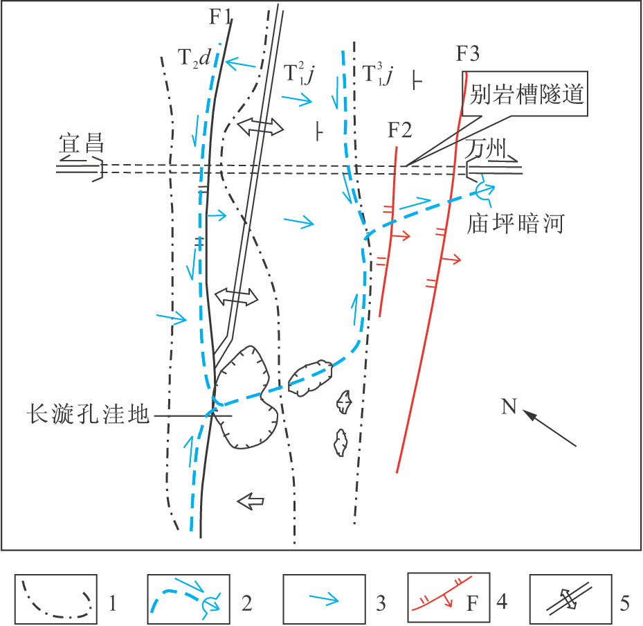 向斜核部處于正地形時,向斜核部為山地臺原,山地臺原發育的溶蝕洼地、巖溶漏斗分布于向斜核部,其方向與向斜軸向一致,核部巖層產狀相向,接收臺原巖溶洼地等的入滲和山地側向巖溶水、地表水的補給,于向斜核部匯聚、徑流成暗河(溶道型巖溶)。如八字嶺隧道工程區為山地向斜,東、西、南三向被河溪深切,北部與大山相連;向斜核部上方山地臺原巖溶發育,降雨入滲匯入核部;北部山地的巖溶水側向補給向斜核部;北部山地下來的響水坪、張三坡兩溪溝的地表水直接注入地下,上述入滲、注入水流于核部匯成牛 鼻子洞暗河,沿軸向徑流、排泄于泗渡河(圖2-7)。