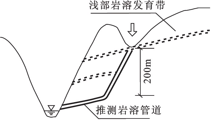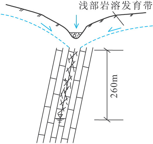 (2)水谷壩槽谷單元。水谷壩槽谷為順陡傾巖層發育的縱向谷,縱向谷匯水面積較大,匯聚滲漏,地表槽谷溪溝成干谷,滲漏水于谷底巖層層間匯聚,縱向徑流,向更遠的排泄基面排泄,遠處排泄基面不斷下切,水流相應適應性下切,促成局部層間深巖溶的發育,隧道處巖溶發育深度達260m(圖2-18)。