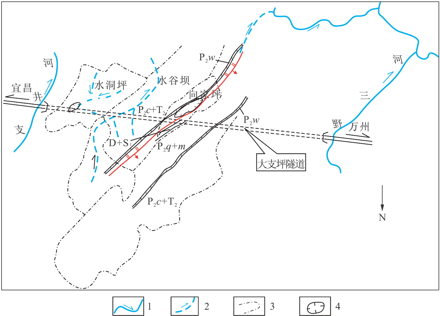 在背斜山地臺原補給→兩翼分流→遇阻水層阻隔匯聚或層間富水層“吸納”匯聚→縱向徑流→不受當地排泄基面制約向更遠的排泄基面排泄的條件下,于聚水層間發育的較深的巖溶,稱為層間深巖溶。如大支坪隧道工程區進口端有三個相對獨立的水文地質單元:水洞坪封閉洼地單元、水谷壩槽谷單元、向家坪洼地單元,發育不同類型的層間深巖溶 (圖2-16) 。
