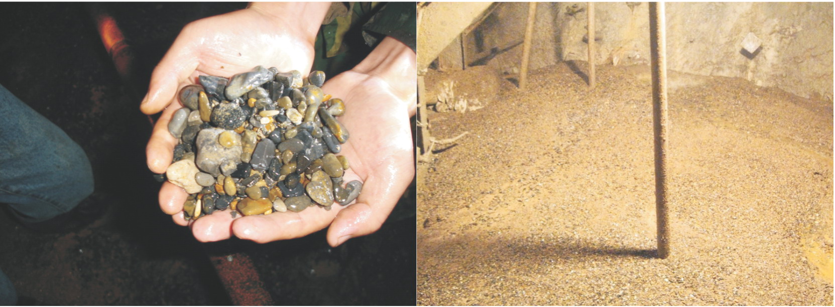 相應隧道標高處發育的巖溶區段為:DK130+500~DK132+100(水洞坪單元區)、DK132+100~DK133+700(水谷壩單元區)、DK133+700~DK134+400(向家坪單元區);巖溶發育形態如圖2-20所示;溶腔充填物主要為軟黏土夾砂、砂夾卵石(圖2-21)。