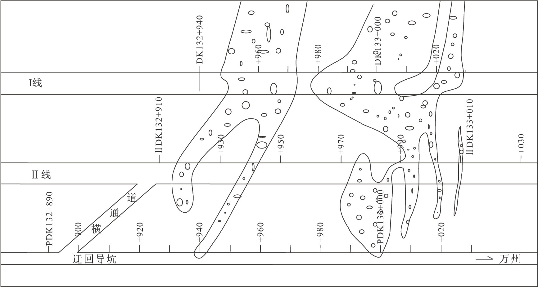 DK132+990溶腔,在I線發育范圍為DK132+940~DK133+035,長95m;在II線發育范圍為IIDK132+912~IIDK133+020,長約108m。迂回導坑揭示裂隙溶腔,分別為PDK132+940、PDK133+000左邊墻。