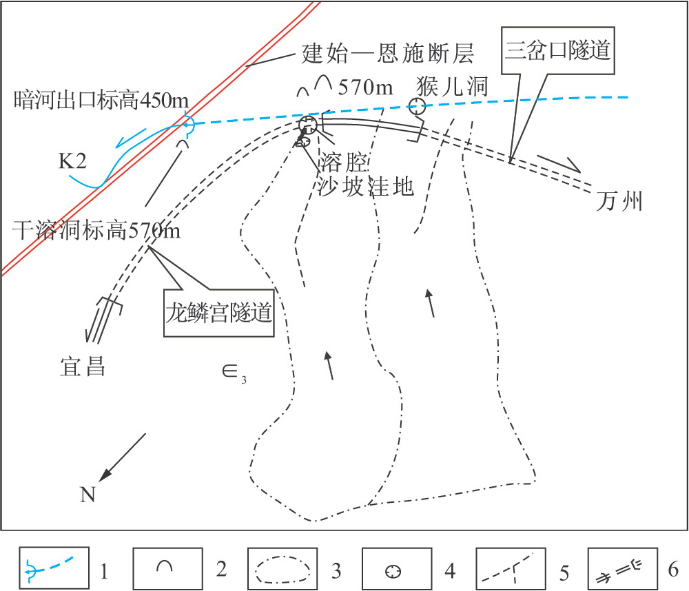 1.暗河;2.干溶洞;3.分水嶺;4.暗河天窗;5.巖溶干溝;6.鐵路線