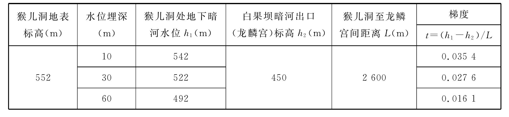 隧道左側的白果壩暗河的猴兒洞至暗河的龍麟宮出口段走向N40°E,暗河出口標高450m,猴兒洞漏斗地表標高552m,兩處相距2 600m。白果壩溝為干溝,白果壩暗河水位在地表以下。猴兒洞漏斗處的暗河水位在地表以下10m、30m、60m的情況下,猴兒洞—龍鱗宮暗河出口段的暗河徑流梯度如表2-7所示。