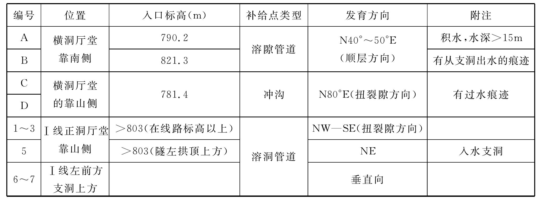 1)據現場調查, 溶腔內主要補給(入水)點及溶腔水文地質特征如表2-8所示。