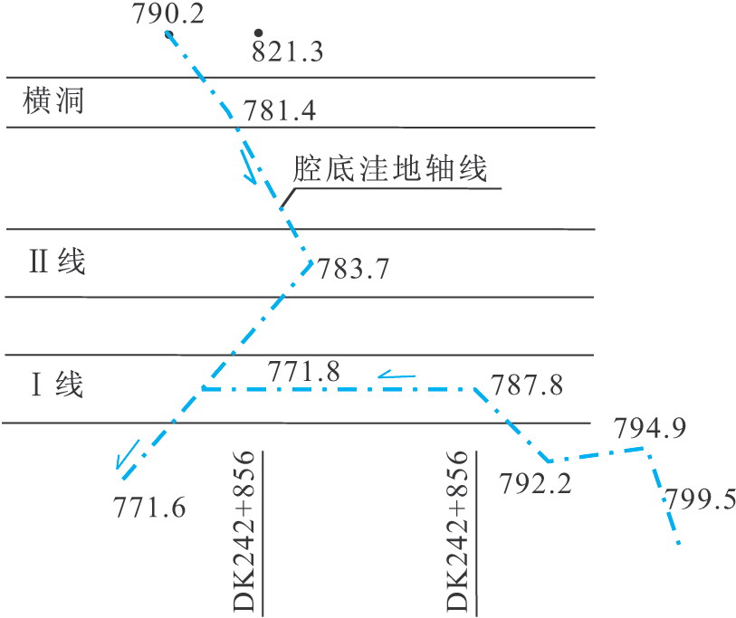 ①溶腔底面標高趨勢分析(圖2-41)。一般底面標高最低處常是水流匯聚和集中的消水點(段)。從圖2-41可知,溶腔底部溝底的地面軸線標高從橫洞→Ⅱ線→Ⅰ線逐漸降低;Ⅰ線右側E巖溶支管道→與Ⅰ線正洞相交處→向Ⅰ線正洞里程減少方向,標高漸低;上兩處降低趨勢皆指向I線DK242+852溶腔底部附近,該處應為整個溶腔的最低洼處,縱斷面圖顯示溶蝕滲漏漏斗(圖2-40)。因此1線DK242+874~+852溶腔底部(連接右下方F支管道)段,可能是整個溶腔的消水段。