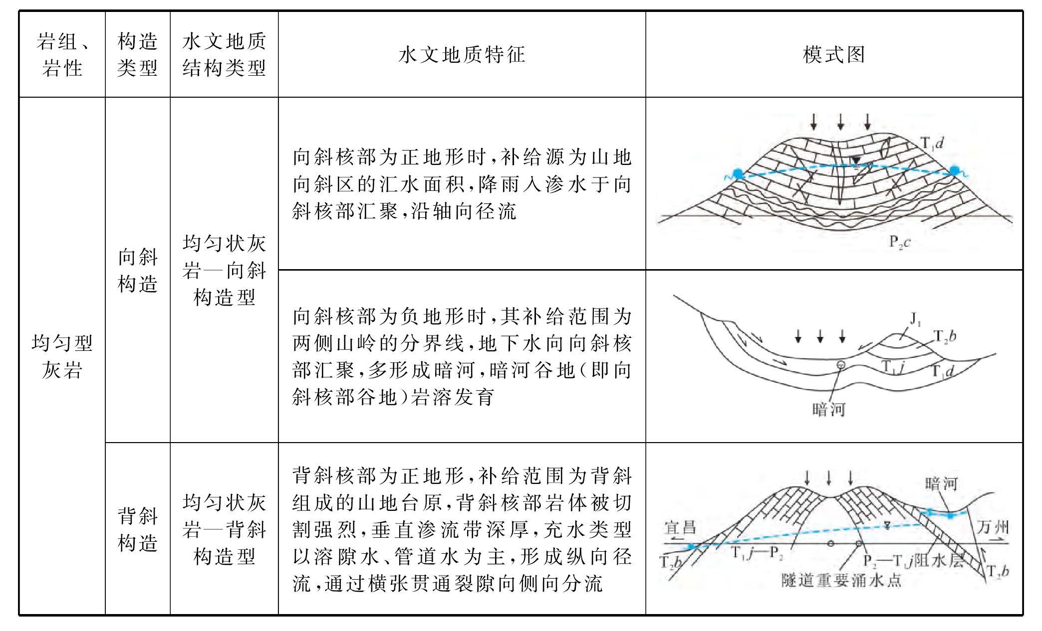 巖溶水對鐵路隧道工程影響最大,造成的危害也最大。因此,對宜萬鐵路巖溶地區進行的巖溶水地質結構的劃分時,當側重考慮隧道工程的需要。主要的巖溶水地質結構類型劃分為均勻型、間互型(灰巖與相對阻水層相間)和單斜構造結構等類型,如表2-10 所示。