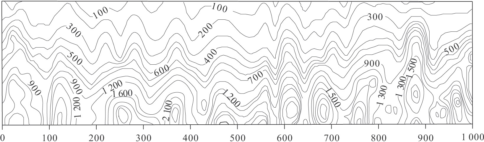直流電測深是應用最廣泛的巖溶探查方法,宜萬鐵路現場試驗證明,在復雜地形條件下,直流電場發生嚴重畸變并沒有辦法改正,不能區分出有用地質信息;同時供電極距在對數坐標上等間隔布置,它依靠供電極距的延長來增加勘探深度,極距越長分辨率越低;因此它只適用于相對平緩的山間谷地中對淺埋巖溶進行勘探。圖3-20是云霧山隧道茅壩槽谷地的直流電測深等視電阻率圖,較好地反映了覆蓋層的變化和灰巖的起伏形態,但在宜萬鐵路能夠應用并取得效果的地方并不多,即使如此,有效勘探深度不超過200m,不能提供隧道圍巖的巖溶發育特征。