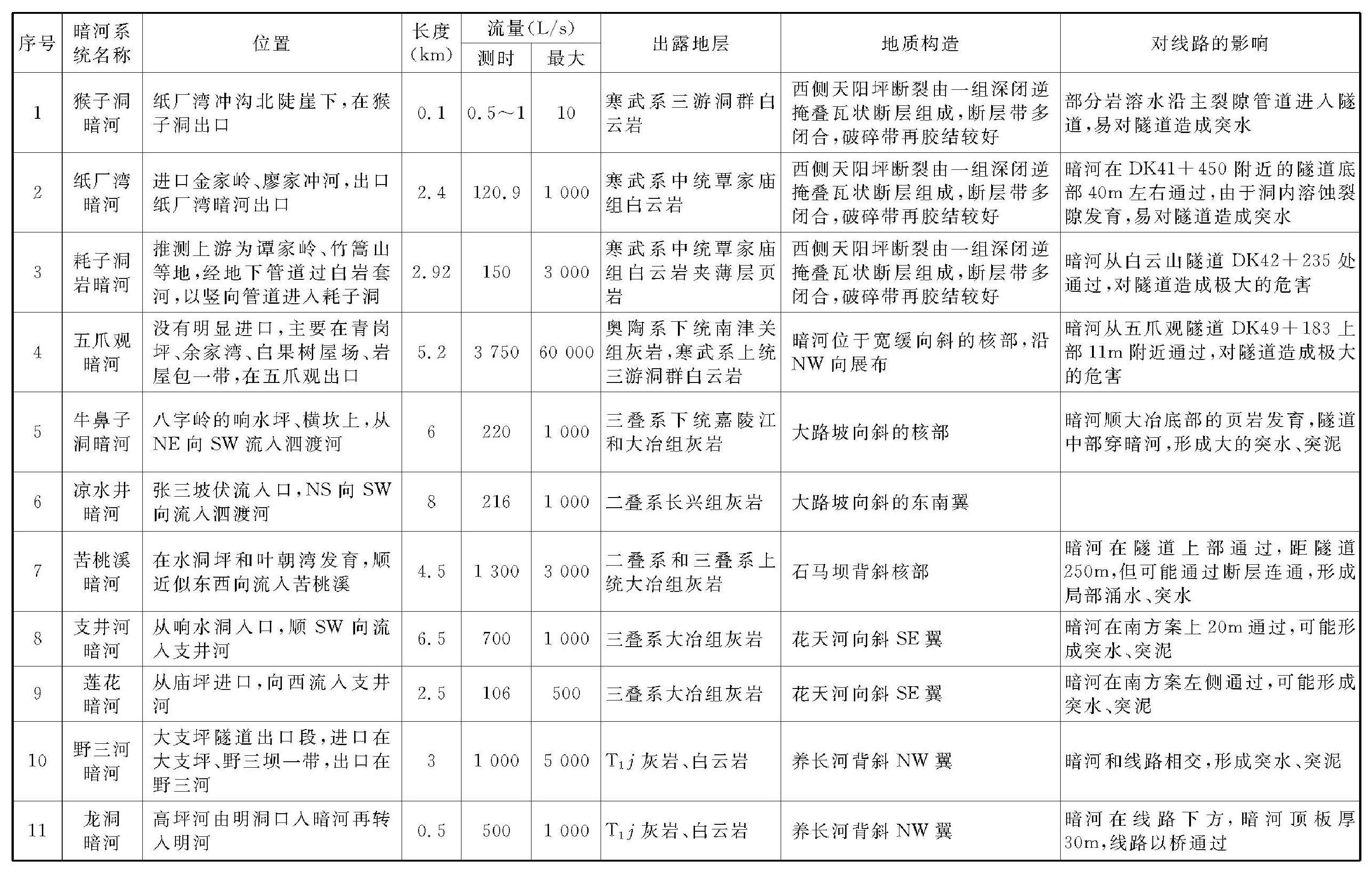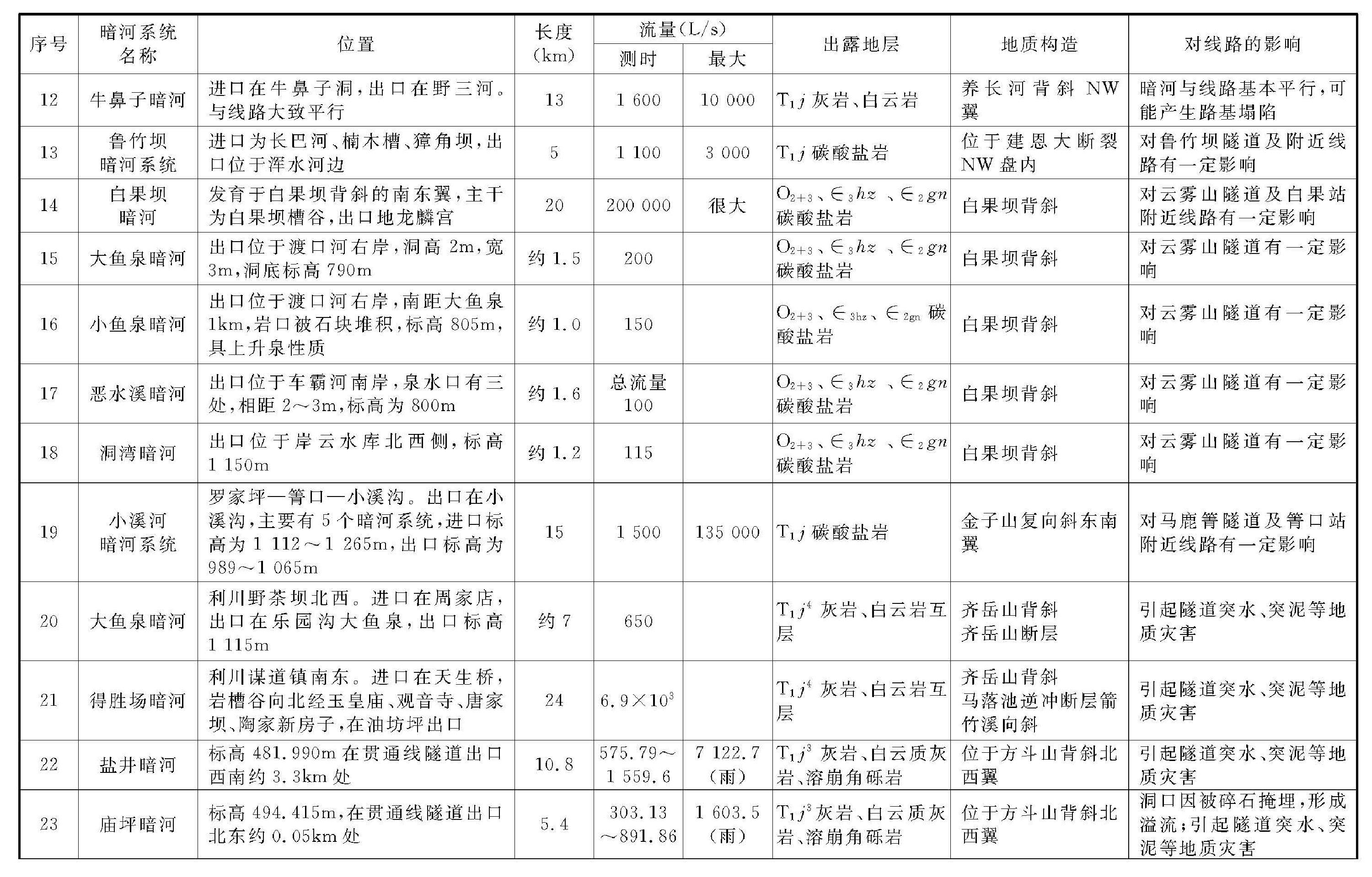 | 齊岳山隧道 | 隧道穿越齊岳山背斜 | 隧道穿越大小斷裂共15條,其中得勝場逆斷層(F11)對隧道施工影響最大 |