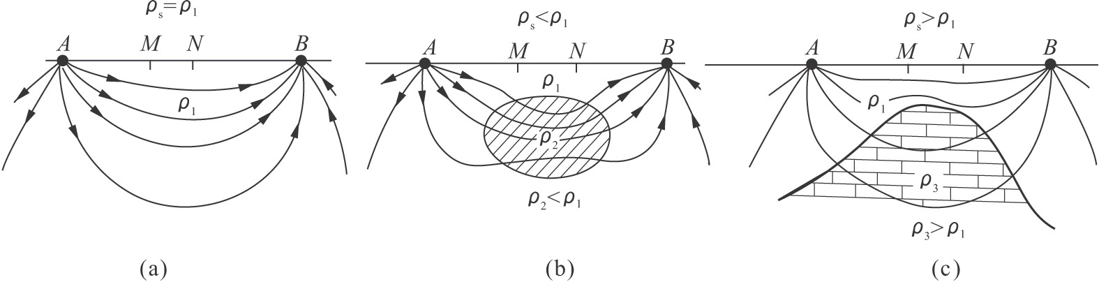 若地下為均勻介質,則四極電測深的電場分布如圖3-19(a)所示。從圖可以看出,電流自A極出發,流經地下介質到達B極,此時測量電極MN所測得的視電阻率ρS與地下介質的電阻率相等。若地下圍巖中賦存良導體時,電測深的電場分布如圖3-19 (b)所示。由于良導體吸引電流使地下的電場分布產生明顯的畸變,測量電極MN附近的電流密度明顯小于均勻介質情況下的電流密度,所測得的視電阻率明顯低于圍巖電阻率,呈現低阻特征。若地下圍巖中賦存高阻巖體,電測深的電場分布如圖3-19 (c)所示。由于高阻巖體排擠電流,使得測量電極MN附近的電流密度比均勻巖石條件下大,因而所測得的視電阻率明顯高于圍巖電阻率,呈現高阻特征。