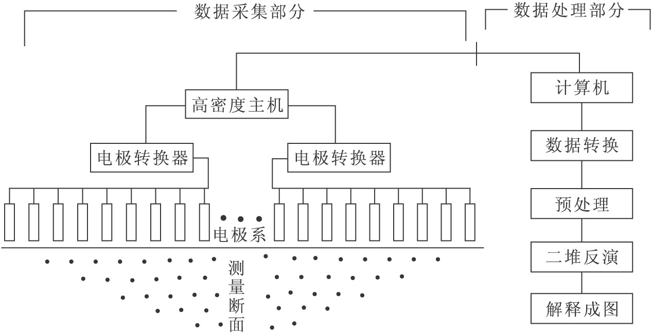 高密度電法是高密度電阻率探測法的簡稱,高密度電阻率探測方法是近幾年來開發研制出的一種新型的直流電法探測系統,是基于垂向直流電測深與電測剖面法兩個基本原理的基礎上,通過高密度電法測量系統中的軟件,控制著在同一條多芯電纜上布置連結的多個(60~120)電極,使其自動組成多個垂向測深點或多個不同深度的探測剖面,根據控制系統中選擇的探測裝置類型,對電極進行相應的排列組合,按照測深點位置的排列順序或探測剖面的深度順序,逐點或逐層探測,實現供電和測量電極的自動布點、自動跑極、自動供電、自動觀測、自動記錄、自動計算、自動存儲。通過數據傳輸軟件把探測系統中存儲的探測數據調入計算機中,經軟件對數據處理后,可自動生成各測深點曲線及各剖面層或整體剖面的圖像。