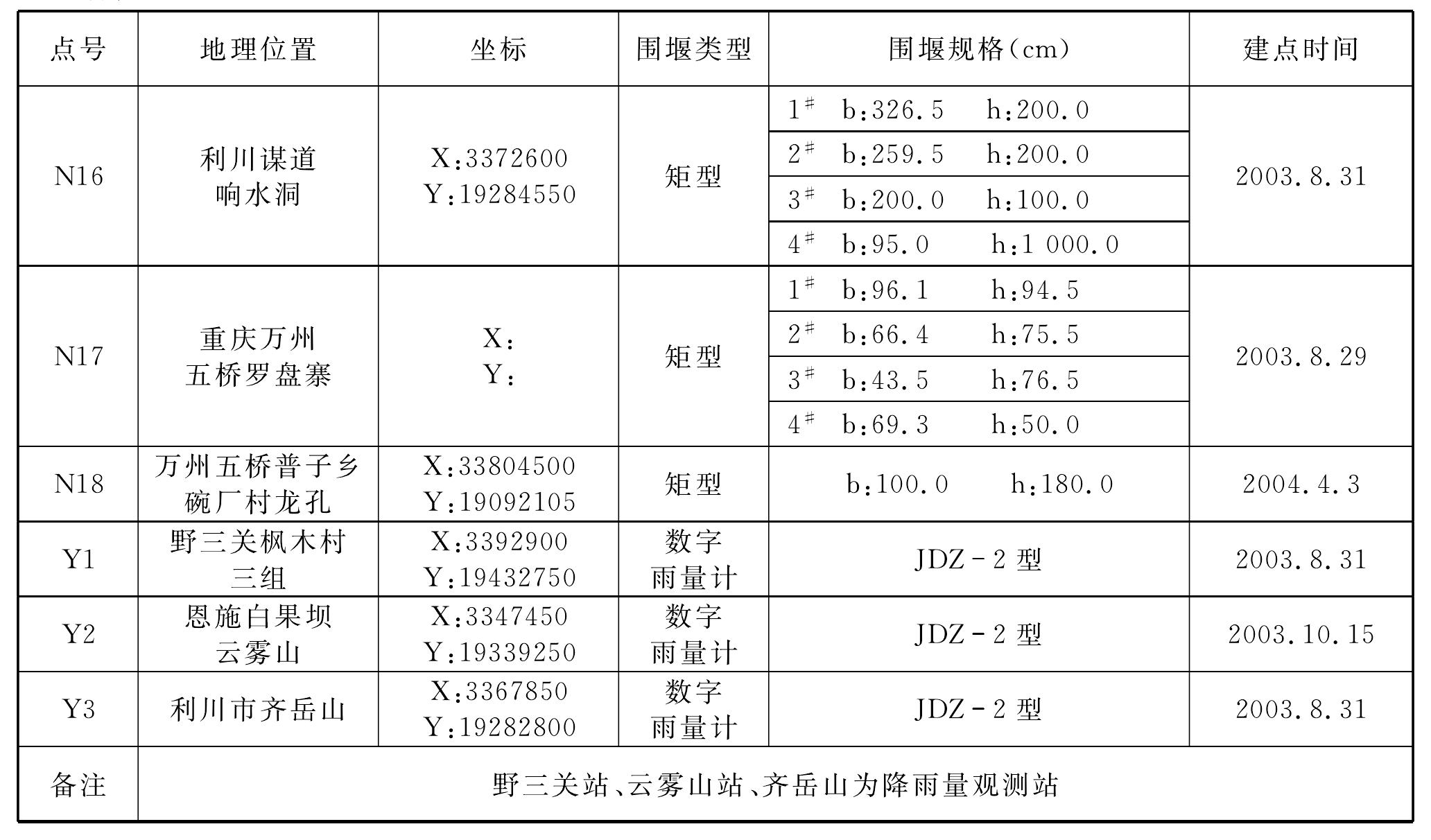 氣象點選用重慶市水文儀器廠生產的JDZ-1型數字雨量計自動觀測儀器。各點的具體位置及修建情況如表3-11所示。