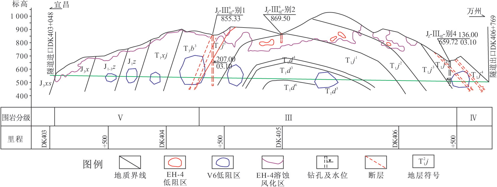 別巖槽隧道的巖溶異常分為表層水平發(fā)育的巖溶異常和具有一定深度的低電阻異常。 表層水平發(fā)育的巖溶異常分布于F1斷層以后的整個灰?guī)r出露地區(qū),溶蝕深度近200m,并分別在DK404+825、DK405+450、+525和+950等處在150~200m深度處存在封閉的低阻巖溶異常,這些異常體與隧道標高有大于200m的高差,一般不會對隧道施工產(chǎn)生大的影響。在隧道標高附近,兩種方法同時存在三處明顯的低阻異常:DK404+000~+150,異常位于巴東組泥灰?guī)r與須家河組砂頁巖的接觸層面上,其長軸方向與巖層產(chǎn)狀基本一致,深度位于隧道洞身,V6的異常 比EH-4顯得寬緩,位置向出口方向偏移,該異常有可能是巖性不均勻引起,但由于發(fā)育于巖性層面附近,且位于洞身,故仍判定為巖溶異常,設計施工應予以重視;在DK406+450和+600兩處,存在明顯的“V”形低阻異常,是以斷層異常為主,伴隨巖溶發(fā)育的異常,具強富水特征,以上三處異常為Ⅰ類異常。另外,在DK403+530、+700、+800、DK404+600、DK405+400和+550等處隧道標高附近,V6有相對低電阻異常,前三個異常位于碎屑巖層當中,分析應為巖性不均勻性引起;后三個異常分別位于嘉陵江組和大冶組地層中,有可能為巖溶發(fā)育所引起,其中位于DK405+550處異常,從地表附近就成“V”形谷發(fā)育,與DK405+525處淺部巖溶異常相疊在一起,極有可能與淺部巖溶相連通,此處也應為Ⅰ類異常,其余兩處為Ⅱ類異常。
