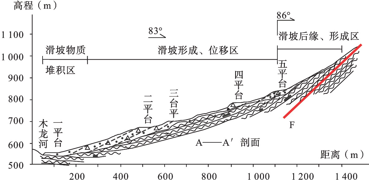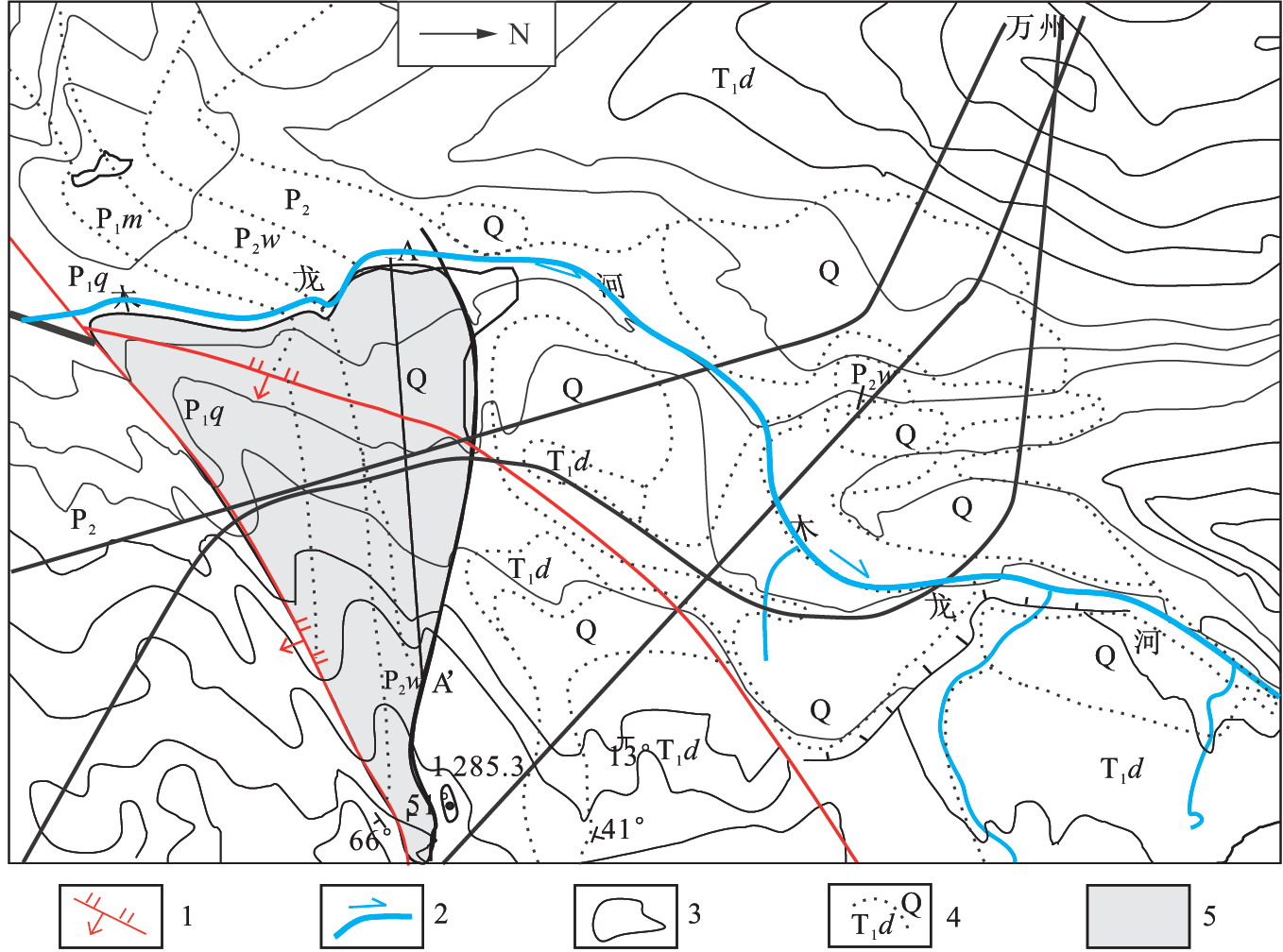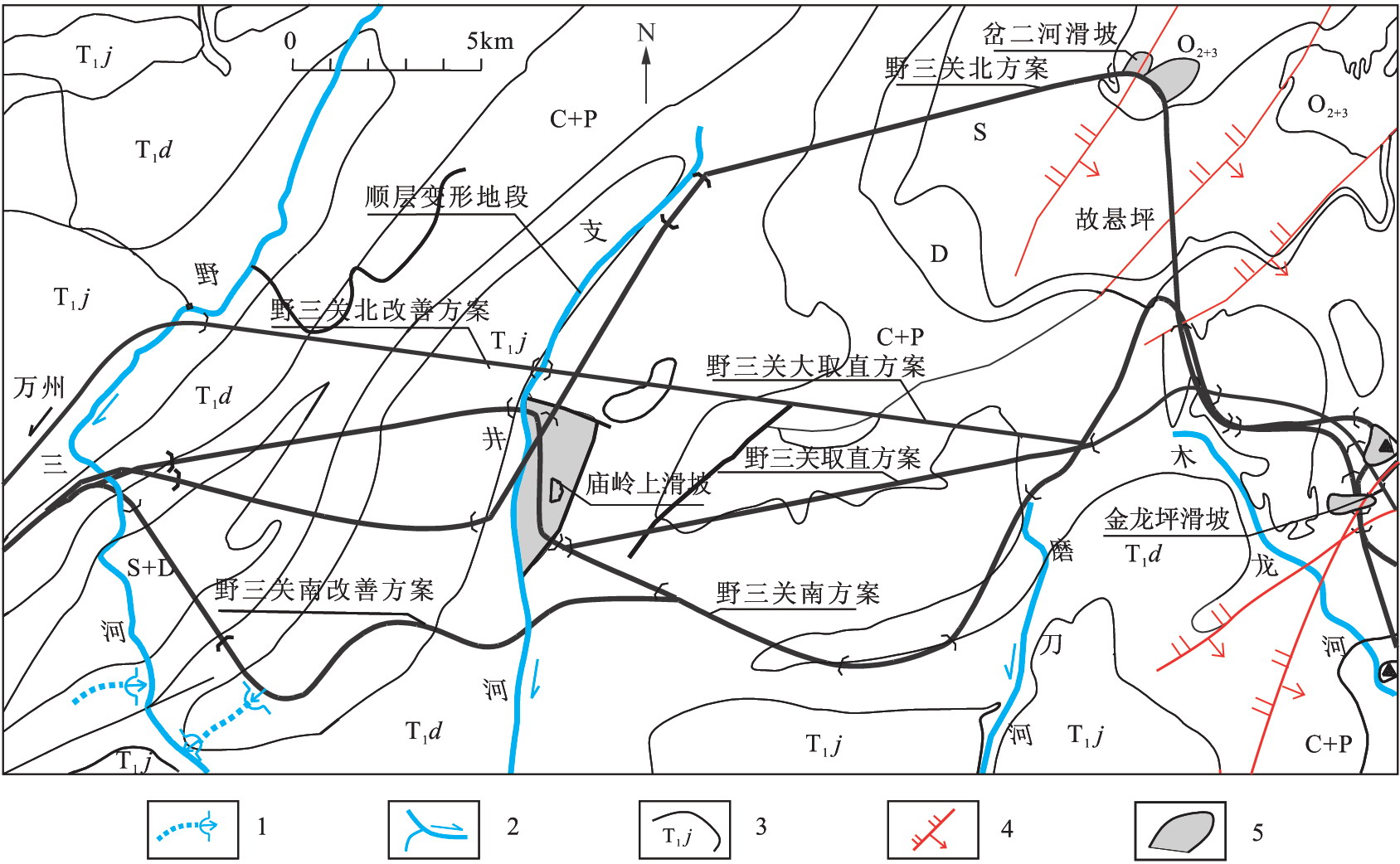 1.斷層;2.河流;3.等高線;4.地層界線;5.滑動體