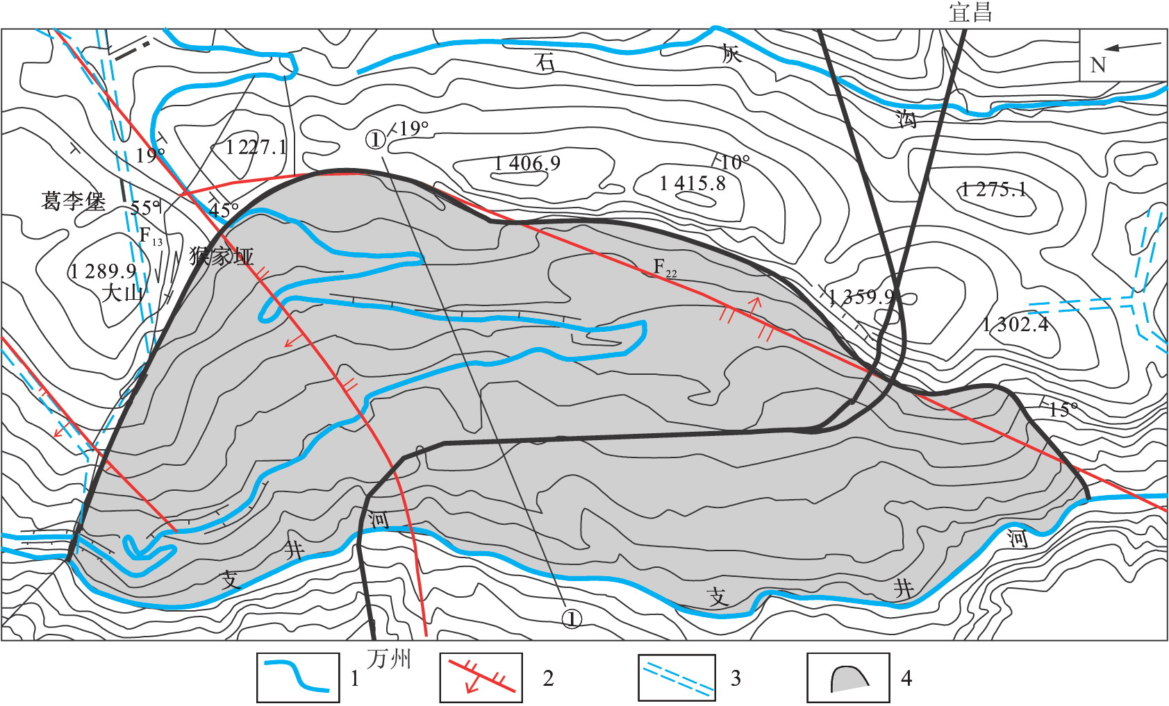 1.河流;2.斷層;3.推測暗河;4.滑坡體