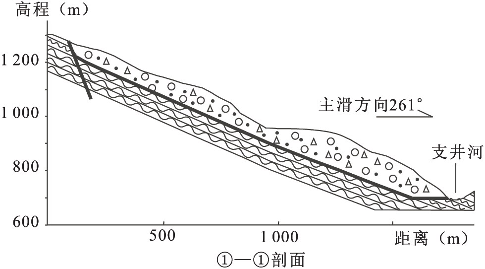 (5)該段控制長大隧道兩端引線部分線路方案的重大不良地質(zhì)有廟嶺上滑坡、金龍坪滑坡、故縣坪滑坡等(圖4-12、圖4-13、圖4-14、圖4-15);此外,線路沿支井河左岸走行地段(約5km),分布大冶組(T1d)中厚—薄層灰?guī)r,巖層傾向線路,傾角38°~56°,自然坡與其一致,邊坡高達(dá)600m,屬基巖裸露的順層地段,目前山體維持平衡穩(wěn)定,局部地段山腰和坡腳堆積順坡坍塌體,鐵路施工必然釀成工程滑坡,邊坡現(xiàn)存的崩坍落石等均難整治和預(yù)防。