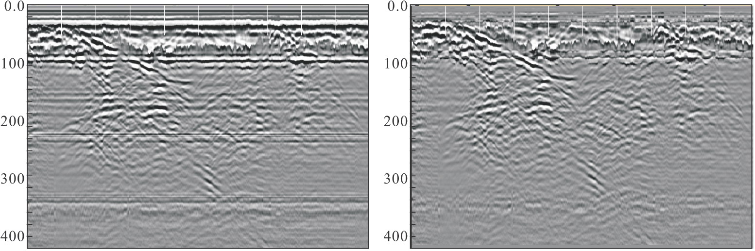 (1)采用結構體掃描識別處理,去除背景干擾。隧道結構體對地質雷達帶來的干擾主要為水平層狀強振幅反射波,既包括隧道側壁、拱頂、鐵軌、排水管等沿隧道縱向延伸的金屬、非金屬線狀結構物,這是可以觀察記錄下來的;也包括鋪底面以下整體施作的鋼筋砼、鋼筋仰拱等具有一定規則線性狀延伸的幾何結構體,這些結構體已被掩埋,但可以通過核查施工資料掌握。以上所述及線狀幾何結構體在地質雷達圖像中均會產生較強的呈層狀水平強振幅,如圖5-31為榔坪3#隧道某段隧底地質雷達圖像處理前后對比圖,處理后的圖像更加突出了地質異常雷達繞射波,信噪比得到了提高。