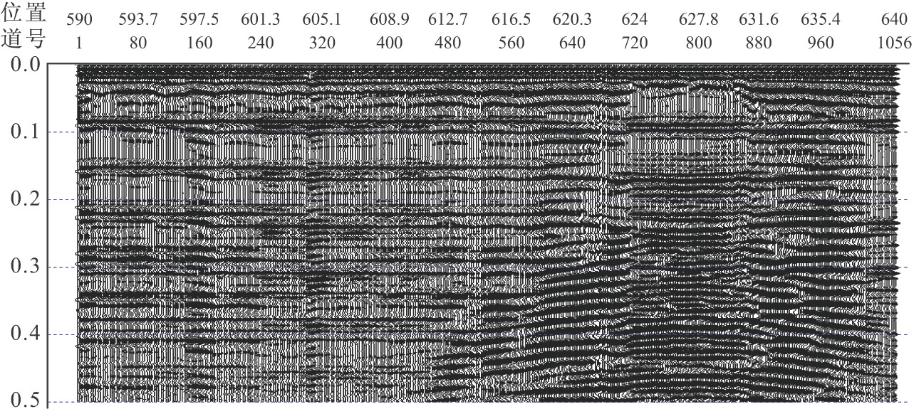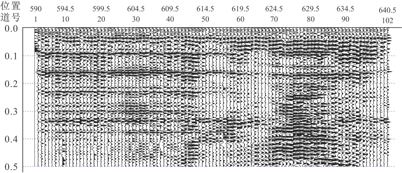 從圖5-28與圖5-29相同地段的雷達不同采集方式所得記錄剖面對比圖可以看出,除了掃描道數的稀疏與緊密造成的雷達時間剖面圖的差異外,兩幅圖的記錄形態、異常展布形態與范圍都是一致的。據此,我們可以認為,在軌道之間同樣可以開展地質雷達探測方法,只是探測方式只能采用點測,且雷達天線裝置方向需平行于鐵軌延伸方向。但是不能選用分離式非屏蔽收發天線裝置進行探測,而應選用性能更優越、收發天線裝置集成式、屏蔽性稍強的雷達儀進行數據采集。