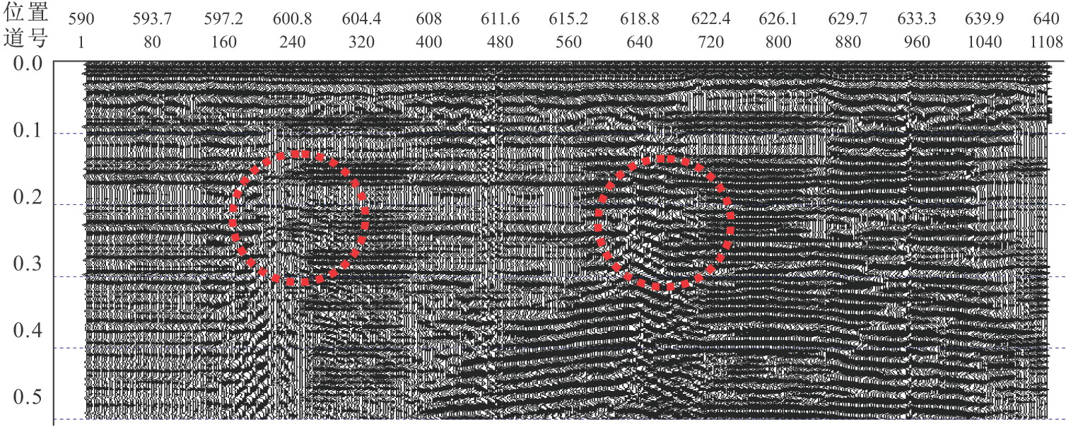 這種情況相對較為簡單,單線情況下,在隧道中線上布置一條雷達剖面即可,雙線情況下在左右中心線上各布置一條雷達剖面,采用剖面法進行探測。根據探測成功經驗,使用加拿大Pulse-EKKO42型雷達儀或美國SIR-20型雷達儀均可,天線中心頻率100MHz,采樣時間不小于450ns。前者采用點測方式,點距不應大于0.5m;后者采用連測方式。每米掃描道數不應小于20道,32~64次疊加。
