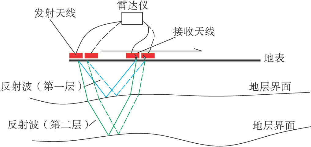 地質雷達測量方法為剖面法,是基于高頻電磁波理論,以寬頻帶、短脈沖的電磁波形式,由地面通過發射天線射入地下,經地下地層或目的體的電磁性差異反射回地面,反射波由另一天線接收,通過分析接收的信號探測地質體,即利用一個天線(T)發射高頻率寬頻帶短脈沖電磁波,另一個天線(R)接收來自地下介質界面的反射波,發射天線和接收天線以固定間距沿測線同步移動,得到該測線的地質雷達時間-平距剖面圖像,如圖5-25所示。