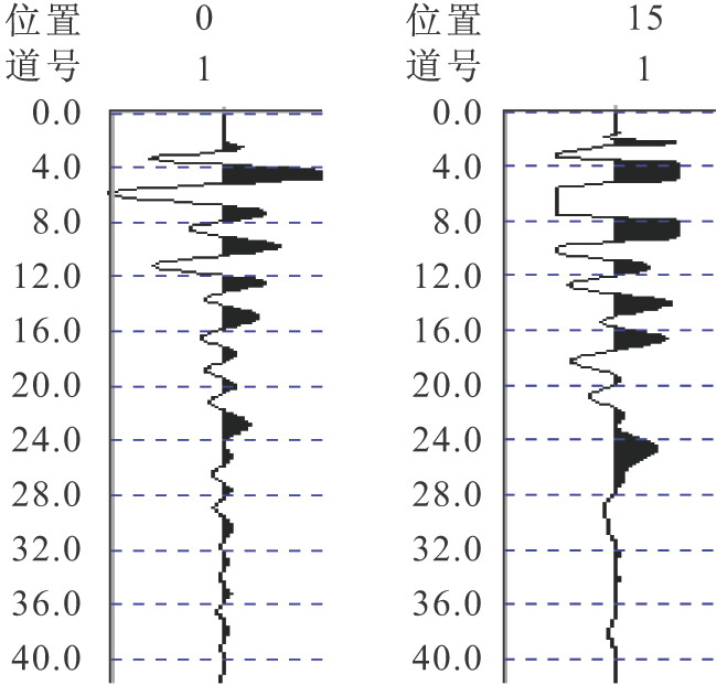 具體采取的試驗(yàn)方式是,選取各種不同場(chǎng)地,在保證能量大小基本相同的情況下,采用4磅小錘進(jìn)行小能量垂直疊加技術(shù)與14磅大錘大能量一次激發(fā)相比較,以了解在兩種情況下地震波波形、頻率方面的變化特征及差異情況。圖5-3為在某隧道基底進(jìn)行的試驗(yàn)結(jié)果,在對(duì)比圖中取了第一道進(jìn)行說(shuō)明,圖中左邊一道波形為4磅小錘進(jìn)行小能量激發(fā),采用3次垂直疊加技術(shù)得到的波形,右邊一道波形為14磅大錘大能量一次激發(fā)得到的波形記錄,二者震幅大小基本相同,對(duì)地層結(jié)構(gòu)的整體反映情況是相似的,但從細(xì)微特征上分析,二者的差別也比較明顯,左邊小能量疊加記錄波形明顯較尖銳,右邊大錘無(wú)疊加記錄則波形較“胖”,表明小能量垂直疊加得到的地震波波長(zhǎng)要短,頻率稍高。此外,通過(guò)垂直疊加技術(shù)對(duì)提高地震波記錄的信噪比也大有益處。