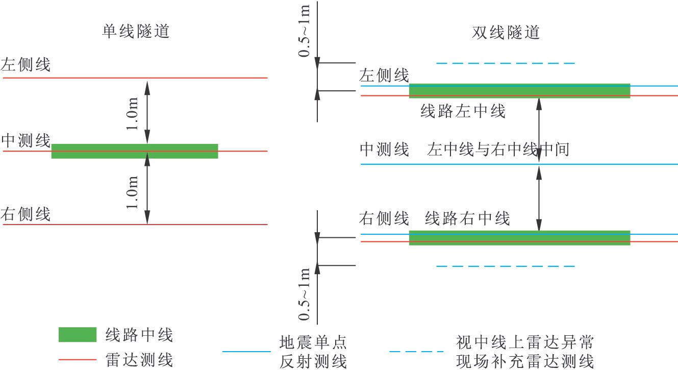 (1)單線隧道中線兩側1m地震單點反射測線各布置一條,中線上地質雷達測線一條。