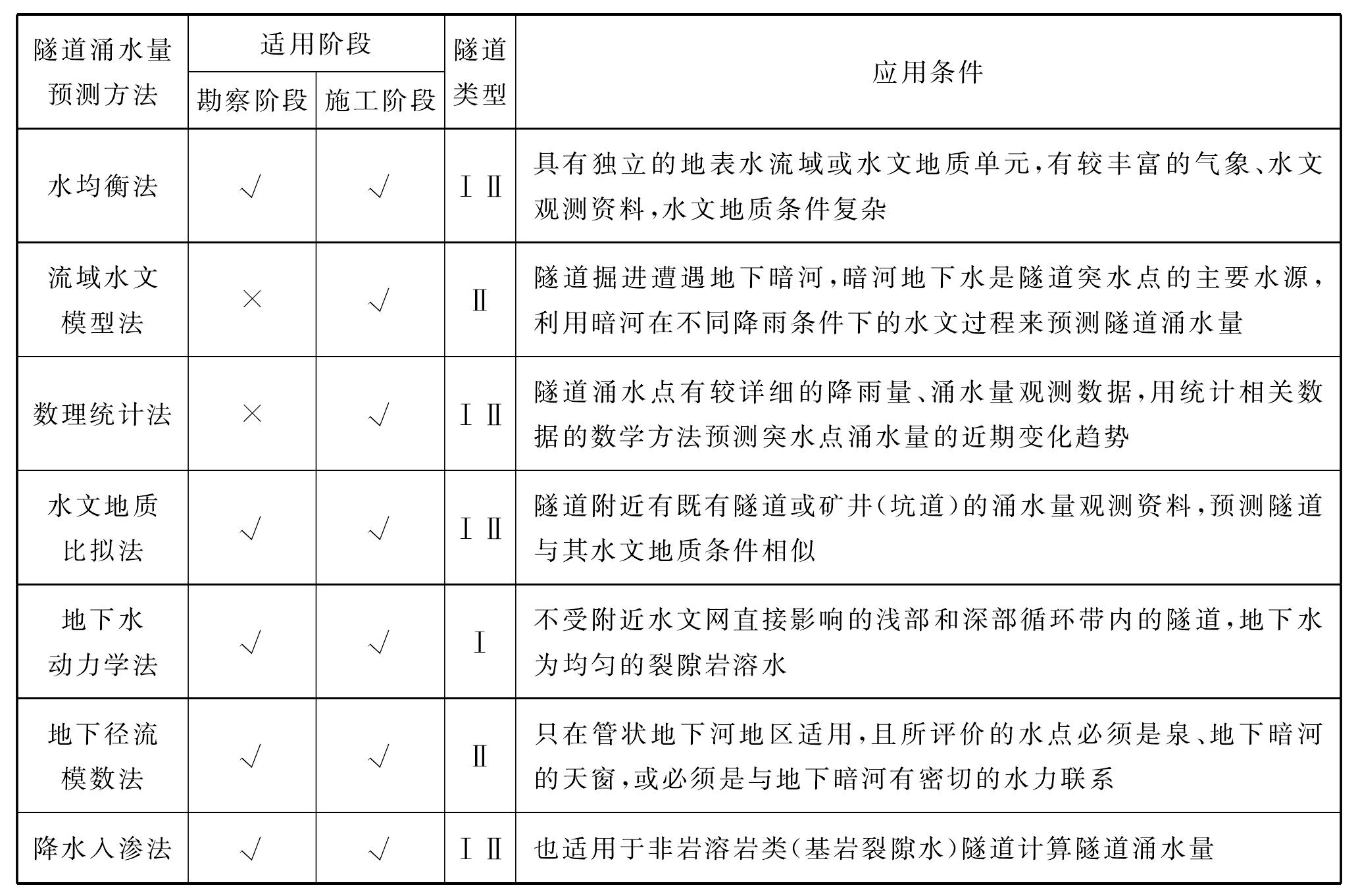 表7-2不同階段、不同類(lèi)型隧道涌水量預(yù)測(cè)方法