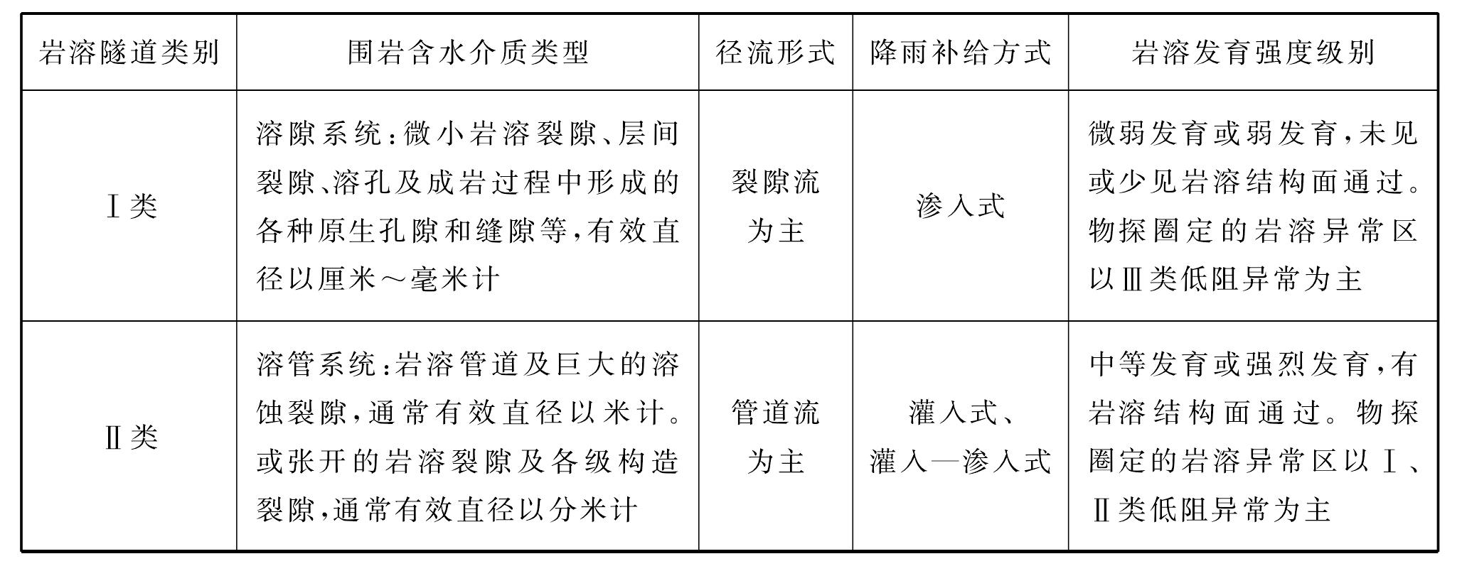根據(jù)隧道圍巖巖溶含水介質(zhì)類(lèi)型及其徑流方式、接受降雨補(bǔ)給方式及巖溶發(fā)育強(qiáng)度級(jí)別,可將巖溶隧道分為Ⅰ、Ⅱ兩類(lèi)巖溶隧道(表7-1)。Ⅰ類(lèi)巖溶隧道圍巖含水介質(zhì)類(lèi)型以溶隙系統(tǒng)為主要形式,裂隙流為主,降雨補(bǔ)給方式以“滲入”式補(bǔ)給為主,巖溶發(fā)育強(qiáng)度為“弱發(fā)育”或“微弱發(fā)育”的巖溶隧道;Ⅱ類(lèi)巖溶隧道圍巖含水介質(zhì)類(lèi)型以溶管系統(tǒng)為主要形式,管道流為主,降雨補(bǔ)給方式以“灌入”式或混合式——“灌入—滲入”補(bǔ)給為主,巖溶發(fā)育強(qiáng)度為“強(qiáng)烈發(fā)育”至“中等發(fā)育”的巖溶隧道。
