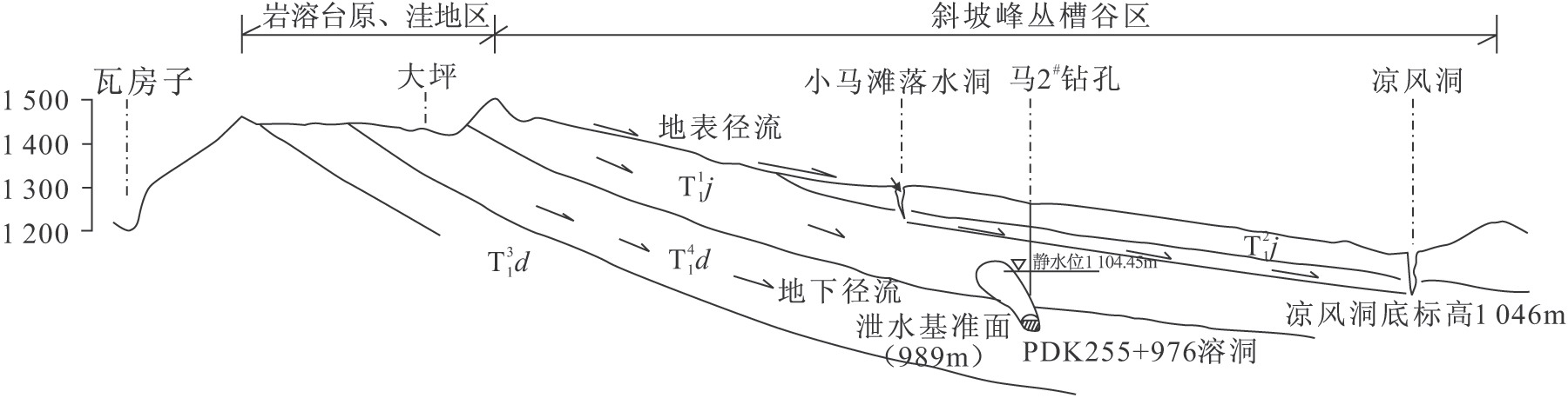 隧道區位于小溪河暗河系統南東部的臺原及斜坡補給區,發育箐口暗河子系統,箐口暗河子系統由東部云霧山臺原和斜坡補給區來水,通過鳥臘河、小馬灘河明流和相應的地下充水管道(暗河)匯入涼風洞,沿層面、節理裂隙至龍潭、蝌螞口。