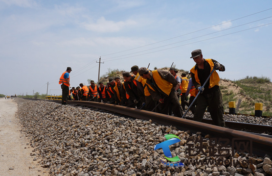 此次卸軌為路橋二隊(duì)8月份的首次途卸,上午8:00隊(duì)安全總監(jiān)組織安全員及防護(hù)員對(duì)卸軌區(qū)段進(jìn)行安全檢查。對(duì)可能碰壞的信號(hào)、通信等行車設(shè)備安設(shè)好相關(guān)標(biāo)示牌,且設(shè)備管理單位已派監(jiān)管至現(xiàn)場(chǎng)進(jìn)行安全監(jiān)護(hù)。同時(shí)要求車站駐站聯(lián)絡(luò)員、現(xiàn)場(chǎng)防護(hù)員及負(fù)責(zé)人現(xiàn)場(chǎng)加強(qiáng)與長(zhǎng)軌列車作業(yè)人員的聯(lián)控。10:40蘇木特車站準(zhǔn)時(shí)給出封鎖時(shí)間點(diǎn),卸軌區(qū)間兩端迅速安設(shè)固定封鎖標(biāo)示牌并安排專職防護(hù)員進(jìn)行防護(hù)。10:50隨著運(yùn)軌列車進(jìn)入途卸區(qū)間,列車按調(diào)度命令位置停下后,現(xiàn)場(chǎng)施工負(fù)責(zé)人通過(guò)對(duì)講機(jī)指揮列車對(duì)準(zhǔn)卸軌位置,列車保持5km/h速度開始移動(dòng),在一片歡呼聲下成功的將長(zhǎng)軌卸到既有線兩側(cè),隨著現(xiàn)場(chǎng)負(fù)責(zé)人高亢的號(hào)子聲,碩長(zhǎng)的撥軌現(xiàn)場(chǎng),所有作業(yè)人員都揮汗如雨,精神振奮,有條不絮在施工負(fù)責(zé)人的指揮下有節(jié)奏的吆喝著將鋼軌撥于路肩下。隨后便開始對(duì)既有線路道床進(jìn)行恢復(fù),并按規(guī)范要求恢復(fù)至標(biāo)準(zhǔn)道床。截止下午13:30路橋二隊(duì)成功完成了3公里7對(duì)長(zhǎng)軌的途卸。