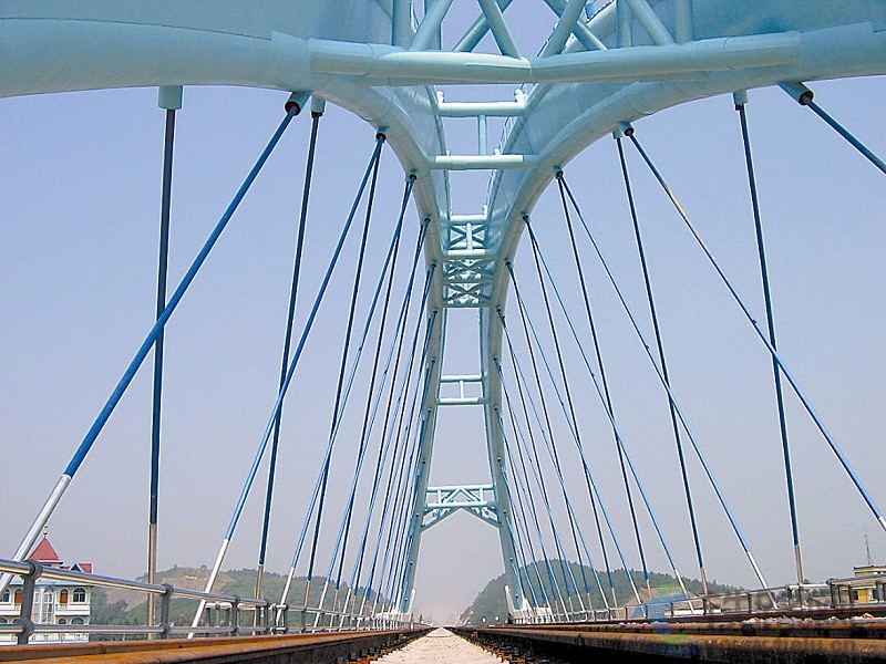 近年來,很多橋梁采用了下部為混凝土梁、上部為預應力索加固的鋼混結構。此類橋梁一般在大橋中部建一個高數十米、甚至上百米的承重主塔,由鋼索把混凝土梁和列車運行時產生的重量均衡傳遞到主塔,以此保持橋梁穩固。