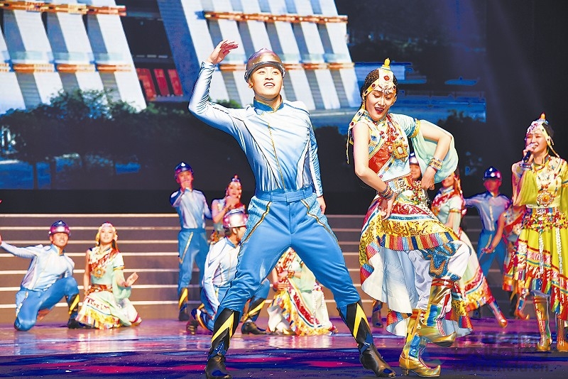 7月6日19點(diǎn)整,垂在舞臺(tái)上的紅幕徐徐拉開,廣袤的高原、冷峻的雪山、飛馳的列車……伴隨著LED顯示屏上不斷閃現(xiàn)的青藏高原絕美風(fēng)景,演員們用靈動(dòng)的肢體語(yǔ)言,為觀眾勾勒出一幅洋溢濃郁高原民族特色的畫面。
