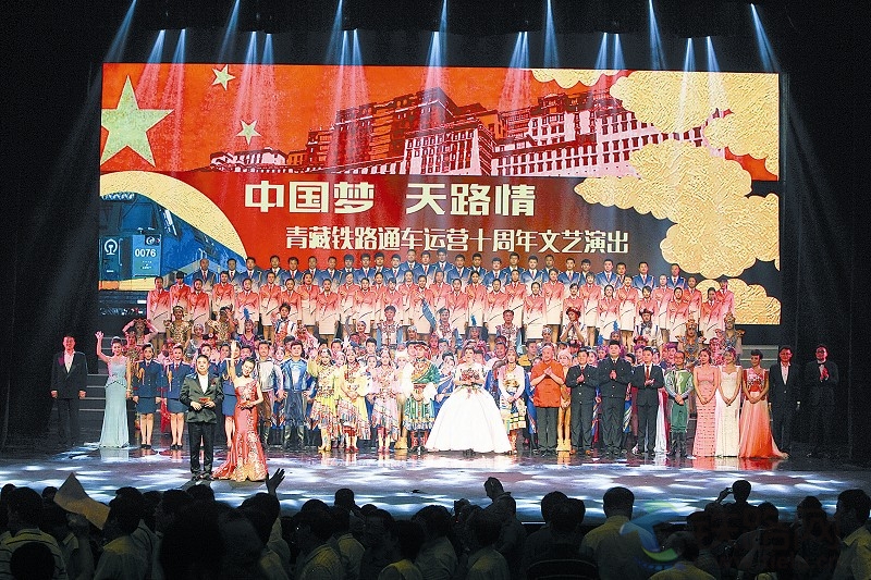 為慶祝青藏鐵路通車運(yùn)營(yíng)十周年,由中國(guó)鐵路總公司舉辦、中國(guó)鐵路文工團(tuán)主創(chuàng)和演出的 “中國(guó)夢(mèng)天路情”青藏鐵路通車運(yùn)營(yíng)十周年文藝演出在北京展覽館劇場(chǎng)上演。