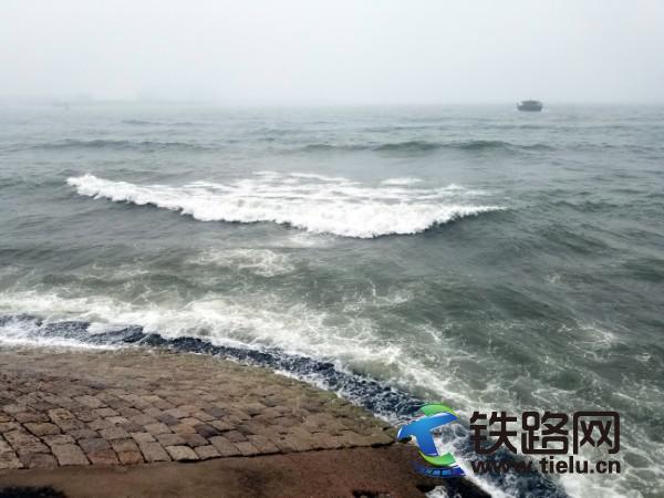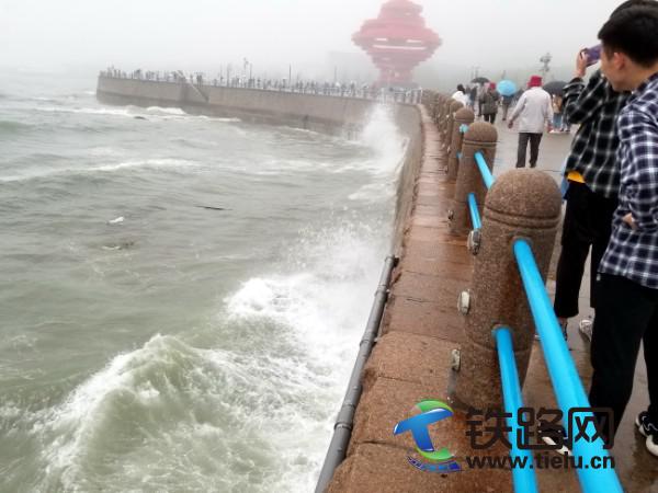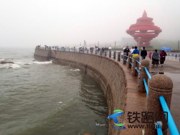 下午五時(shí)許,五四廣場游客絡(luò)繹不絕,冒著雨,撐著傘,獨(dú)自游,結(jié)伴游,團(tuán)體游,緊緊繞著黃海堤岸,觀賞大海的力量。