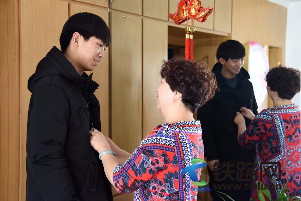 9.呼鐵青年志愿者馬澤軒的母親給兒子整理衣著。