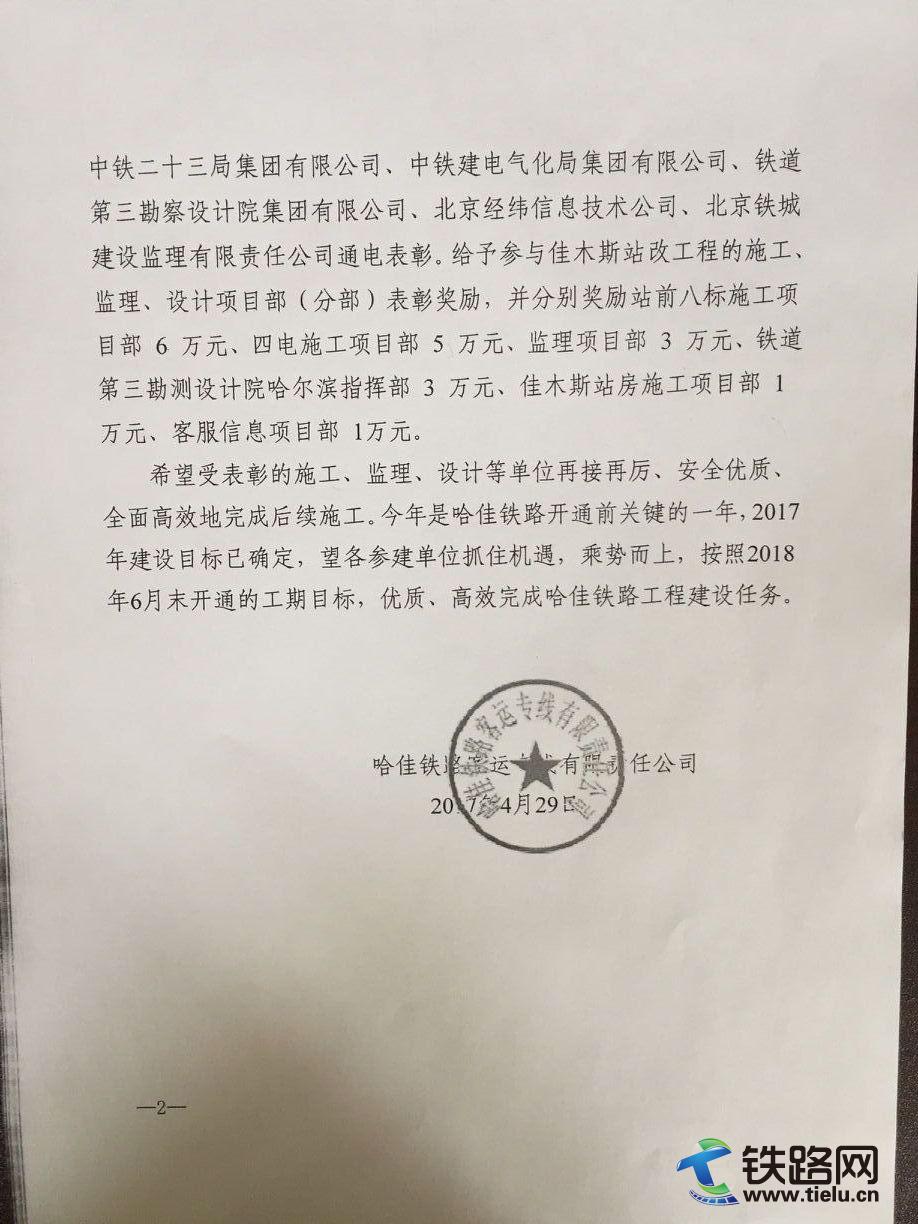 近日,中鐵二十三局哈佳協(xié)調(diào)指揮部捷報頻傳,繼4月29日清晨由項(xiàng)目部組織施工的佳木斯站改過渡工程(8—12線)提前順利通車后,鑒于項(xiàng)目部的施工組織得力,哈佳鐵路客運(yùn)專線有限責(zé)任公司又發(fā)來嘉獎電,給予哈佳項(xiàng)目部(站前八標(biāo)施工項(xiàng)目部)通電嘉獎,并獎勵項(xiàng)目部6萬元。