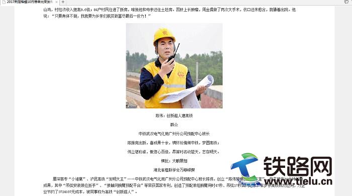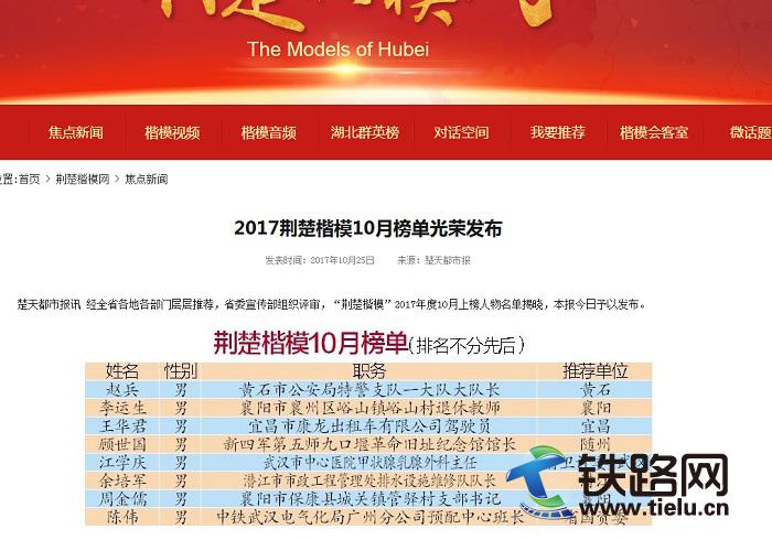 10月25日,經(jīng)湖北省各地各部門層層推薦,湖北省委宣傳部組織評審,“荊楚楷模”2017年度10月上榜人物名單揭曉。其中,經(jīng)湖北省國資委推薦,中國中鐵武漢電氣化局集團(tuán)廣州分公司東海島項(xiàng)目部預(yù)配中心班長陳偉位于8人上榜人物之列。