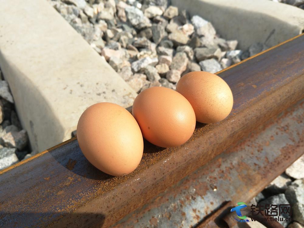 午后的鋼軌在太陽暴曬下溫度可高達60多度,正好幾天做個試驗,取一枚新鮮雞蛋將其打在鋼軌軌面上,來一份“煎雞蛋”如何?等待半小時后,這“煎雞蛋”雖然看上去不是金黃,但小編保證這雞蛋熟了,一顆糖心雞蛋好嘍!可想而知用“高溫炙烤”來形容并不為過!